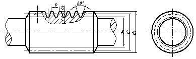 蝸桿一般選用一個(gè)視圖,其齒頂線、齒根線和分度線的畫法與圓柱齒輪相同,如下圖所示。圖中以細(xì)實(shí)線表示的齒根線也可省略。齒形可用局部剖視或局部放大圖表示。