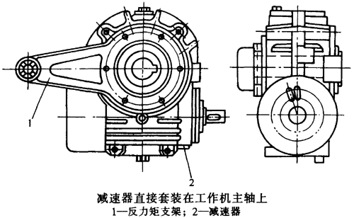 減速器直接套裝在工作機主軸上,當減速器運轉時,作用在減速器箱體上的反力矩,由安裝在減速器箱體上的扭力臂或其他方法來平衡。扭力臂一端是與減速器直接相配,