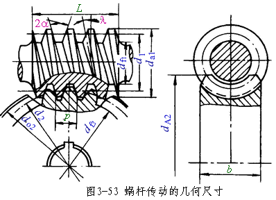 本節只討論普通圓柱蝸桿傳動,或稱阿基米德圓柱蝸桿傳動(在垂直于蝸桿軸線的剖面中,齒廓線是一條阿基米德螺旋線,故稱為阿基米德螺桿)。 圖3-53所示,通過蝸桿軸線并垂直于蝸輪軸線的平面為主平面。在主平面上,蝸桿的齒廓與齒條相同,兩側邊為直線,夾角2a=40°;而蝸輪的齒廓為漸開線,即在主平面內,蝸桿與蝸輪的嚙合如同齒條與齒輪的嚙合一樣。因此,蝸桿傳動的主要參數和幾何尺寸計算大致與齒輪傳動相同,并且在設計、制造中皆以主平面上的參數和尺寸為基準。普通圓柱蝸桿傳動參數已標準化。