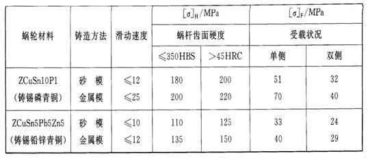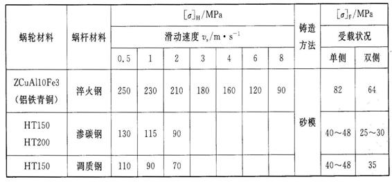 表7-4 鋁鐵青銅及鑄鐵蝸輪的許用應力