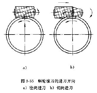 切制蝸輪時,有兩種進(jìn)刀方法,徑向進(jìn)刀法和切向進(jìn)刀法,見圖3-55。